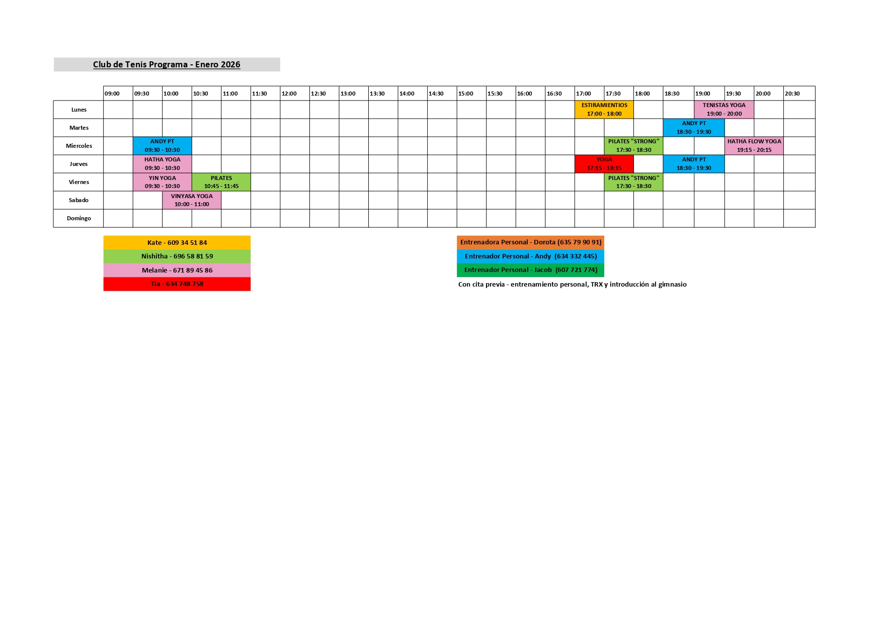 Adjuntamos el programa de actividades de nuestra sala polivalente del mes de enero de 2026. Con clases semanales de yoga, pilates, estiramientos y entrenamiento personal. Está dirigido para nuestros socios/socias y también para el público en general.