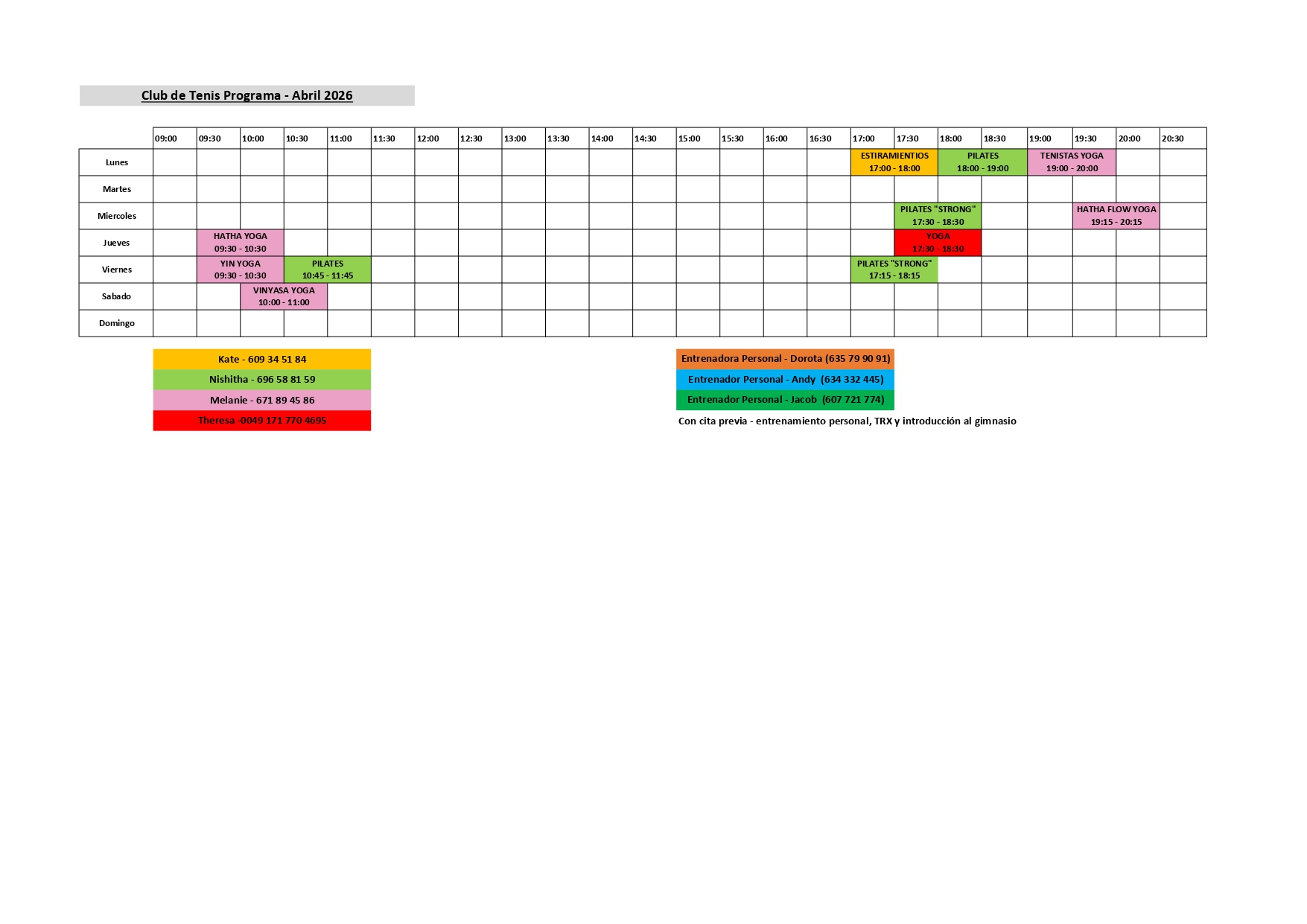 Adjuntamos el programa de actividades de nuestra sala polivalente del mes de abril de 2026. Con clases semanales de yoga, pilates, estiramientos y entrenamiento personal. Está dirigido para nuestros socios/socias y también para el público en general.
