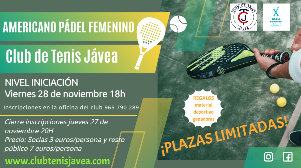 El próximo viernes 28 de noviembre de 2025 vamos a celebrar un torneo de pádel Americano femenino de nivel iniciación a partir de las 18h. Está destinado para nuestras socias y el público en general.