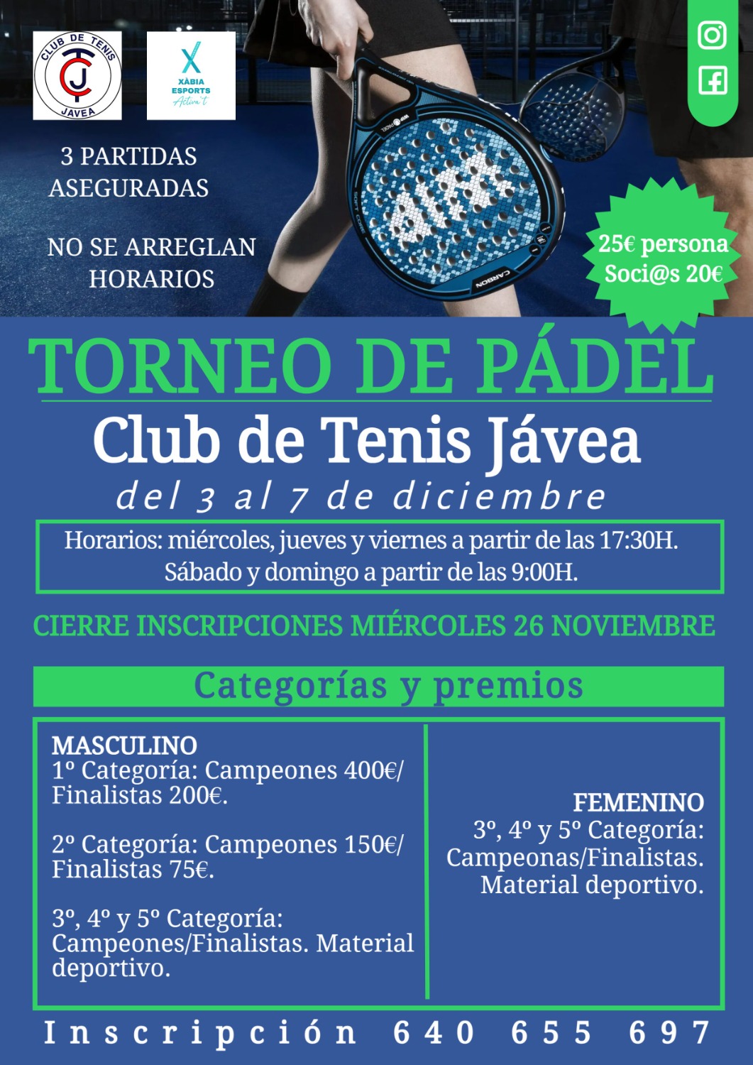 Las inscripciones están abiertas hasta el próximo miércoles 26 de noviembre (incluido) y el precio es de 25 euros por persona y de 20 euros para los socios y socias del CTJ. Podéis solicitar más información y realizar vuestra inscripción llamando al 640 655 697, organiza el Club de Tenis Jávea.